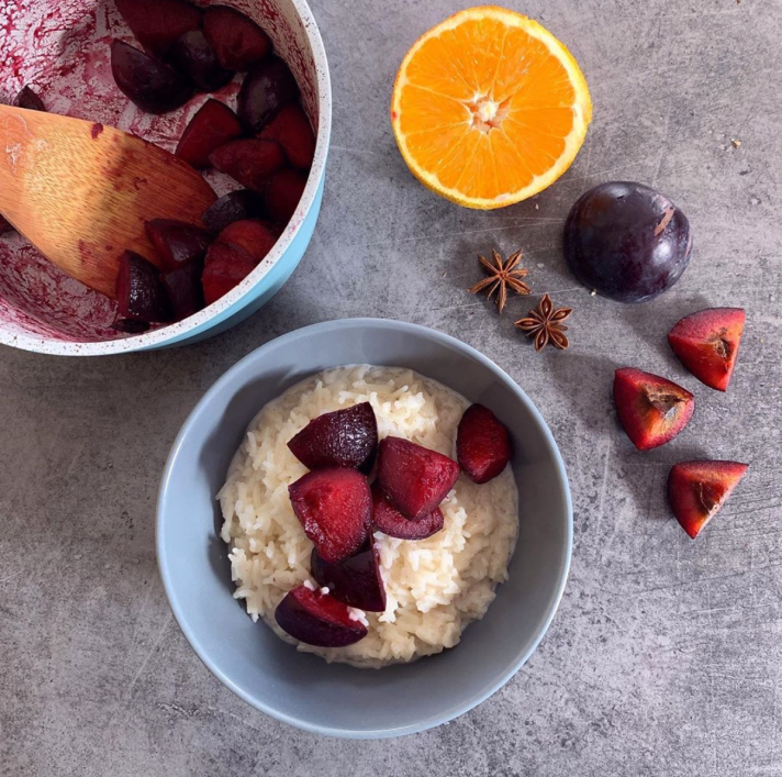 Накиснете стафиди в ром и карамелизирайте 1/4 ч. фъстъци. След като изстинат фъстъците, блендирайте. Поръсете по края на купичката, а в центъра поставете сливите.