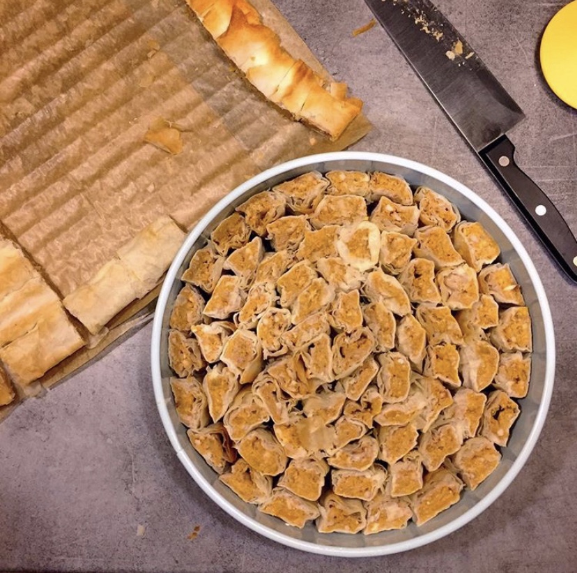 Запържвате тиквата, захарта, канелата и орехите. Разпределяте сместа равномерно и намазвате върху двоен лист кори за баница. Навивате и нареждате в правоъгълна тава, като оставяте парчетата прави (без да прегъвате или завъртате).