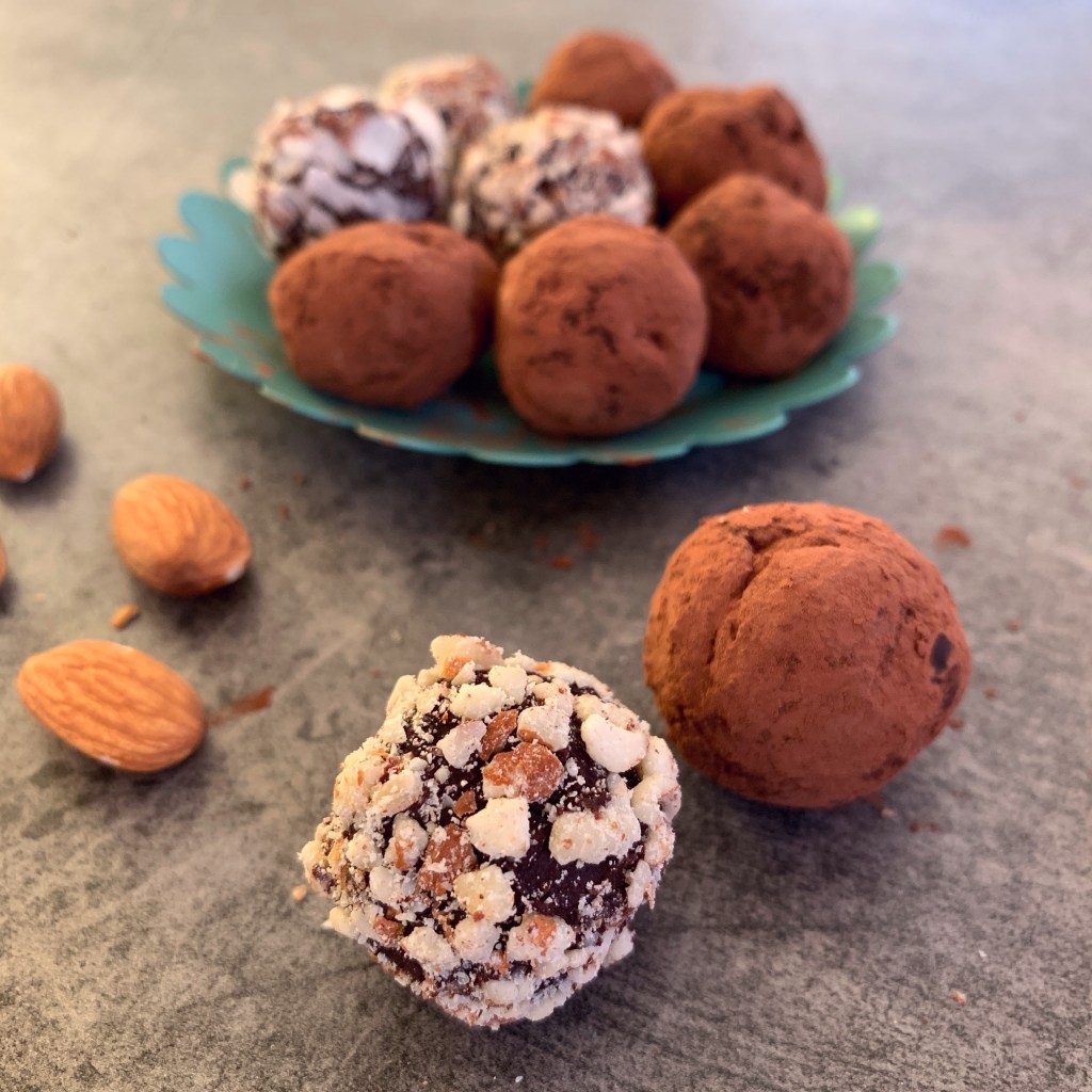 За хрупкав вкус карамелизирате фъстъци. Блендирате и оваляте трюфелите в тях.