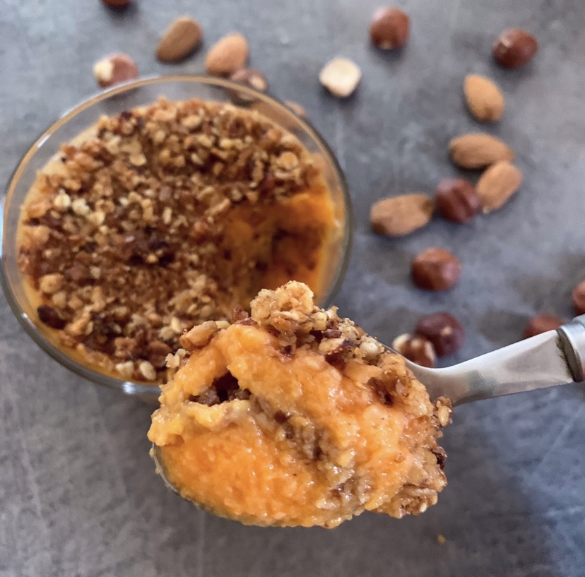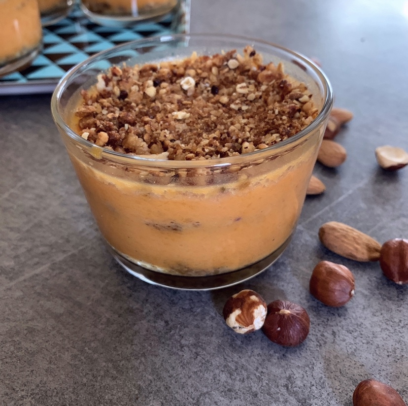 В подходящи за печене чашки редувате 1 с.л. крекер, 1 черпак крем, 1 с.л. крекер, 1 черпак крем. Поставяте чашите в тава напълнена с 1/3 вода. Печете в предварително загрята фурна на 150 градуса за 20 минути.