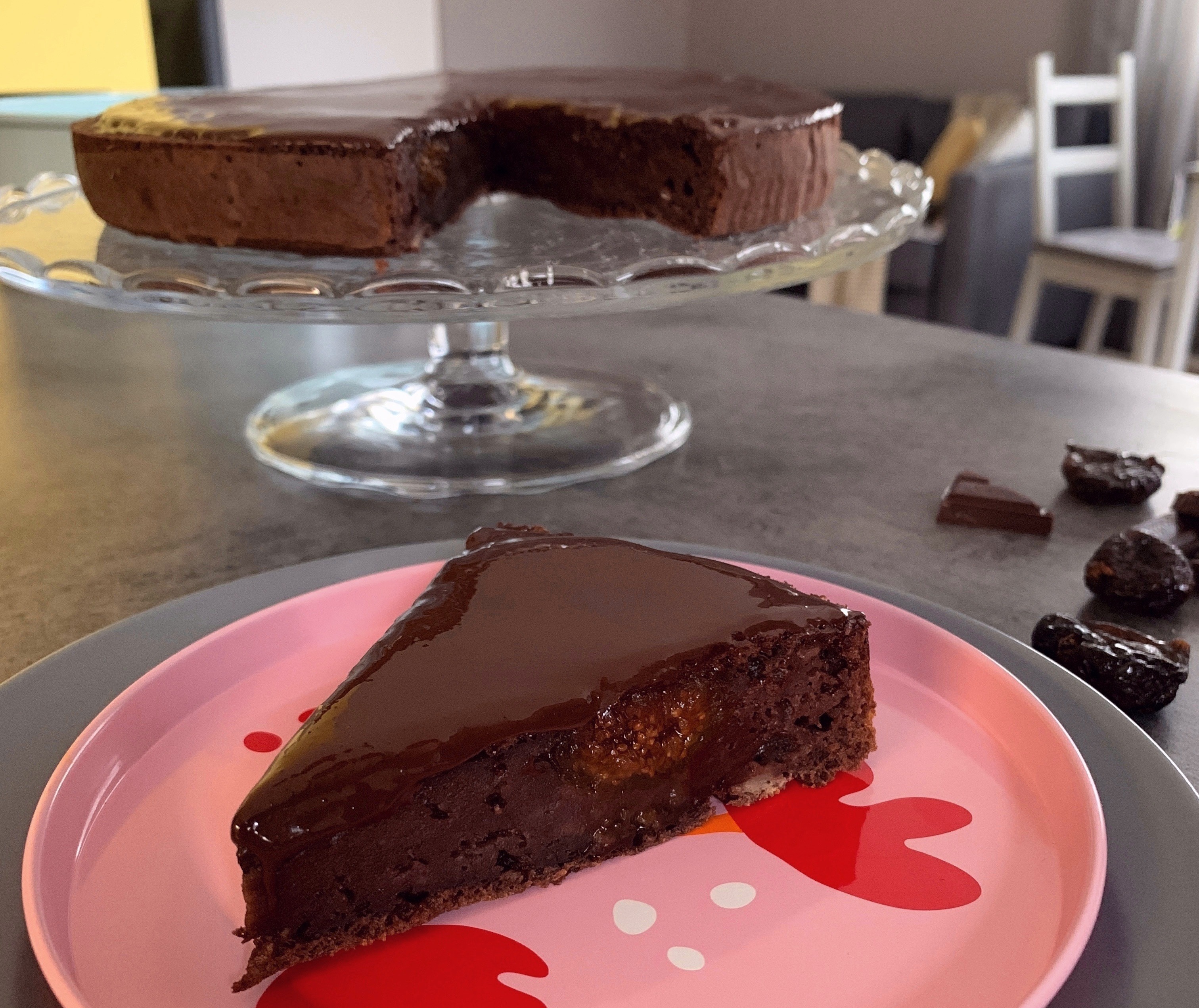 Оставете десерта да си почине 20 мин. след което извадете от формата. След изстиване залейте със 100 г черен шоколад, разтопен на водна баня с 1 с. л. олио.