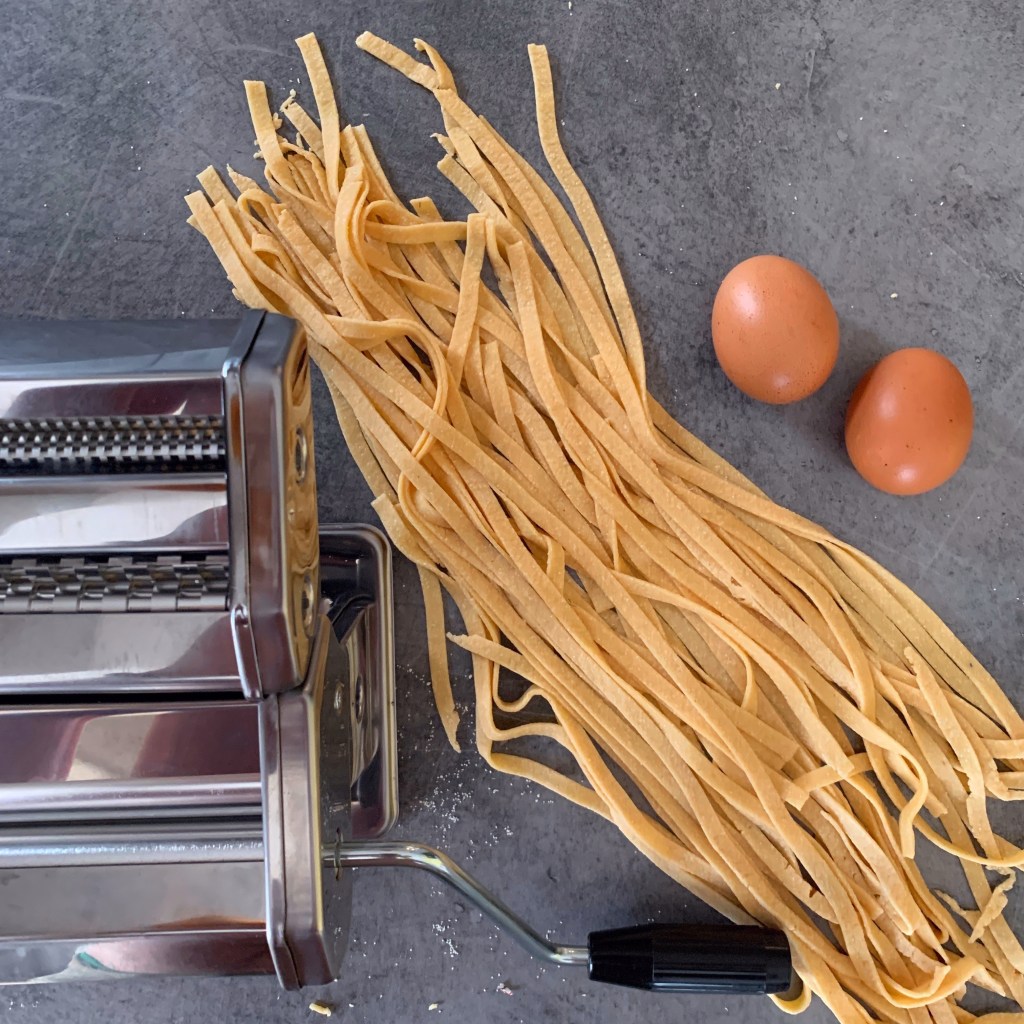 Отпусналото се тесто е по-гъвкаво в следствие от глутена. Разточете равномерно с точилка или с помощта на машина за паста. Нарежете на тънки ивици с дебелина половин пръст. Във вряща осолена вода, сварете пастата за 3 мин. Така тя ще е „Al dente“ (леко лепкава).