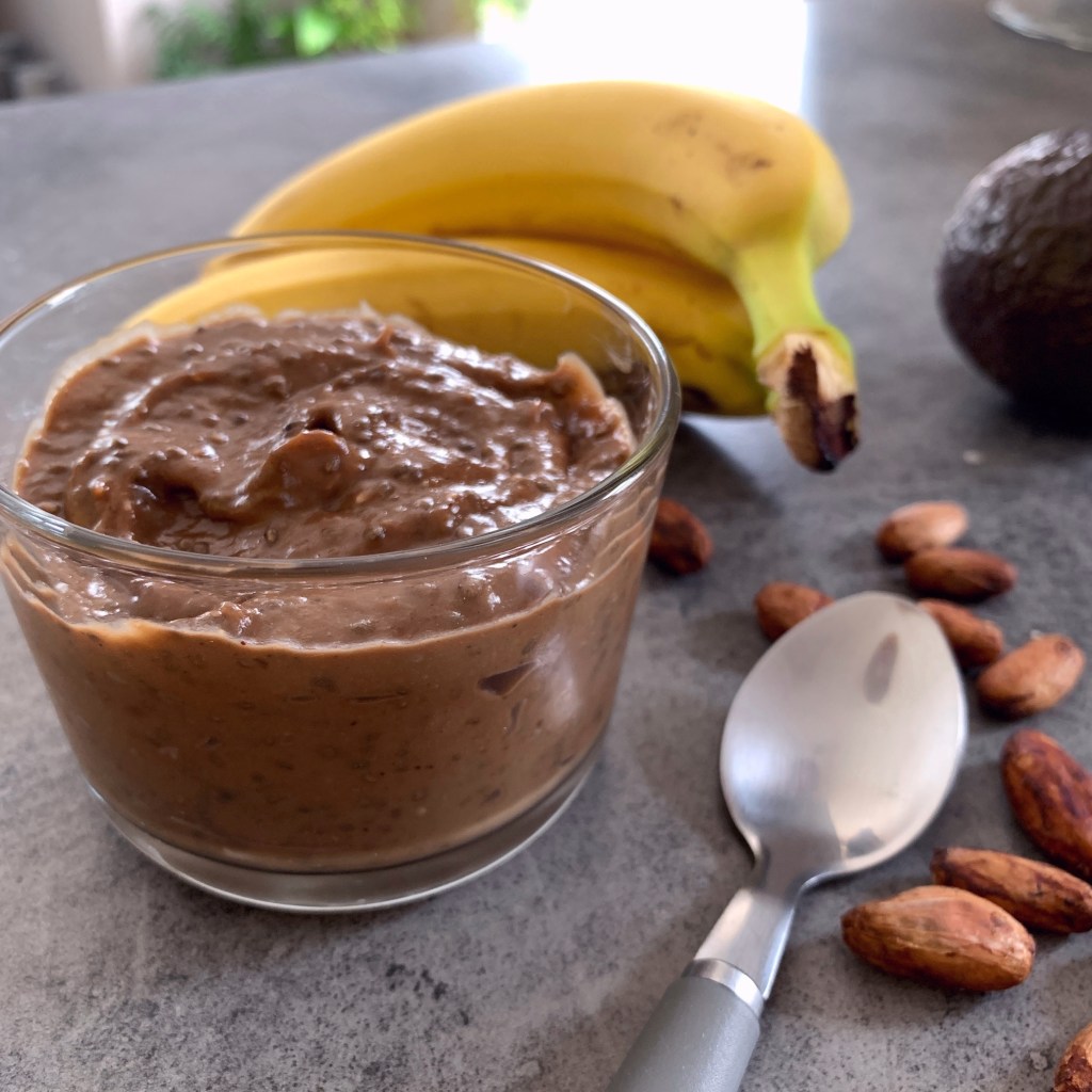 Пасирайте авокадото и банана. Разбъркайте лешниковият тахан с меда и какаото. Добавете към пасираната смес и бъркайте до получаване на хомогенна смес. Изсипете в любима купичка.