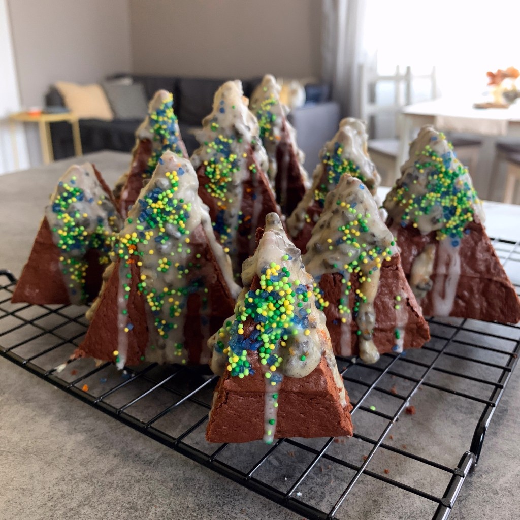 Нарежете сладкиша на триъгълници. В купа изстискайте сока от портокала и добавете пудра захар, до получаване на консистенция на боза. Залейте триъгълниците със сместа, след което поръсете с декоративни захарни топчета. Когато изправите триъгълниците ще наподобяват на малки елхички. Весели празници!