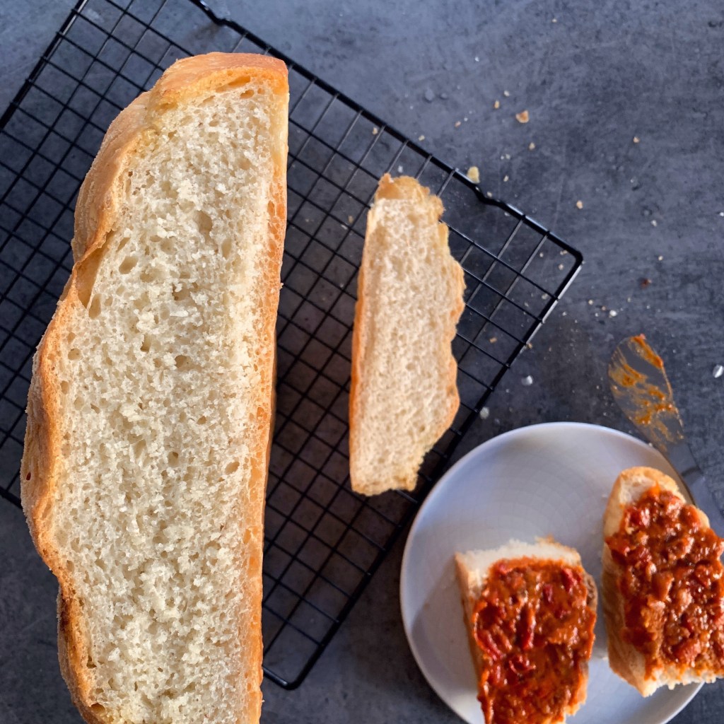 Пресявате брашното, оформяте кладенче в него и изсипвате мая и захар. Постепенно добавяте топлата вода, като разбъркате с шпатула или ръка. Размесвате и оставате да втаса за 1 час като покриете с кърпа.