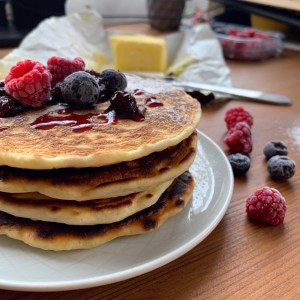 Разбивате яйцето, към него добавяте бакпулвер, захар, прясно мляко и бъркате като поетапно сипвате от брашното до получаване на хомогенна смес. В нагорещен тиган с капка олио изсипвате 1 черпак от сместа в центъра на тигана като оставяте сместа да се разпредели от само себе си. Запичате по 1 минута на всяка страна.