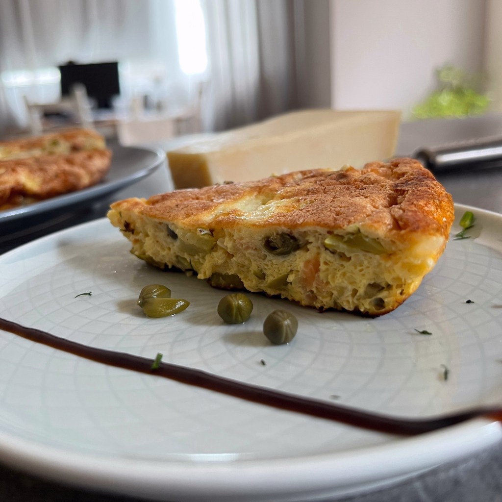 В купа разбивате жълтъците, сметаната, пармезана, черният пипер и солта. Добавяте лука, каперси, лук, на ситно нарязано сьомгата и киселите краставички. Разбърквате внимателно на ръка, като добавяте белтъците на сняг.