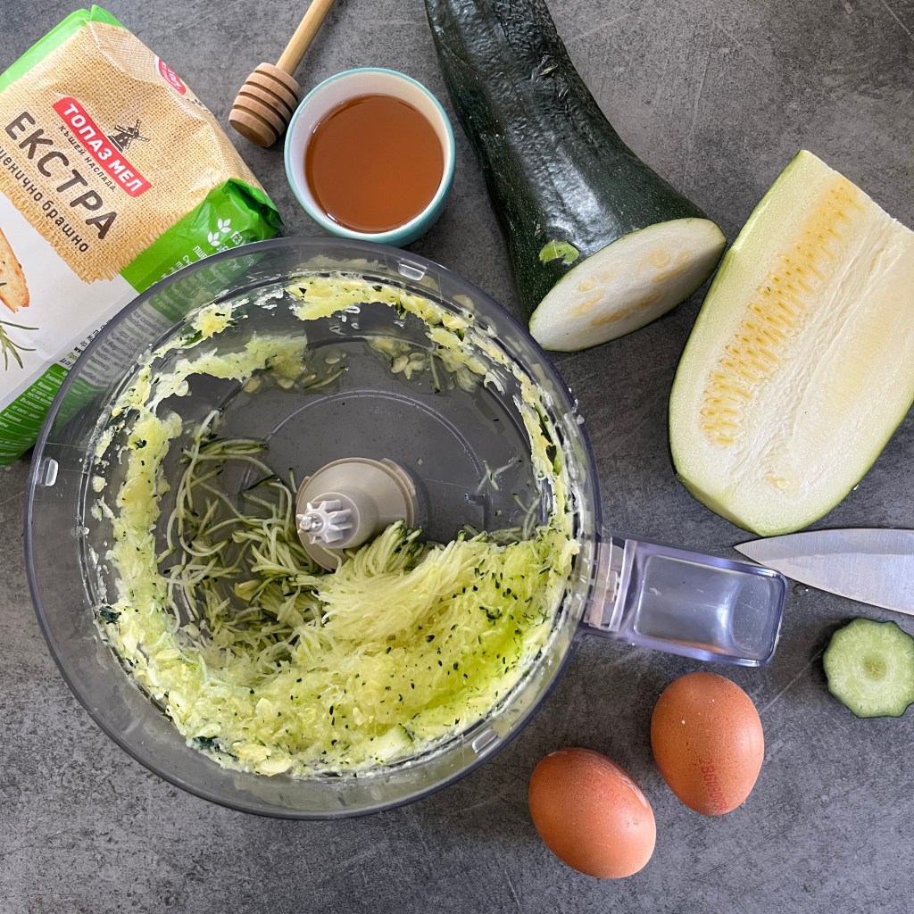Разбивате хубаво маслото и меда до пухкава еднородна смес. Докато бъркате добавете едно по едно яйцата. Настържете кората на портокала и прибавете в смета. Разбърквате на ръка като прибавяте брашното заедно с останалите продукти. Накрая добавяте добре отцедената настъргана тиквичка. Бъркате до хомогенност.