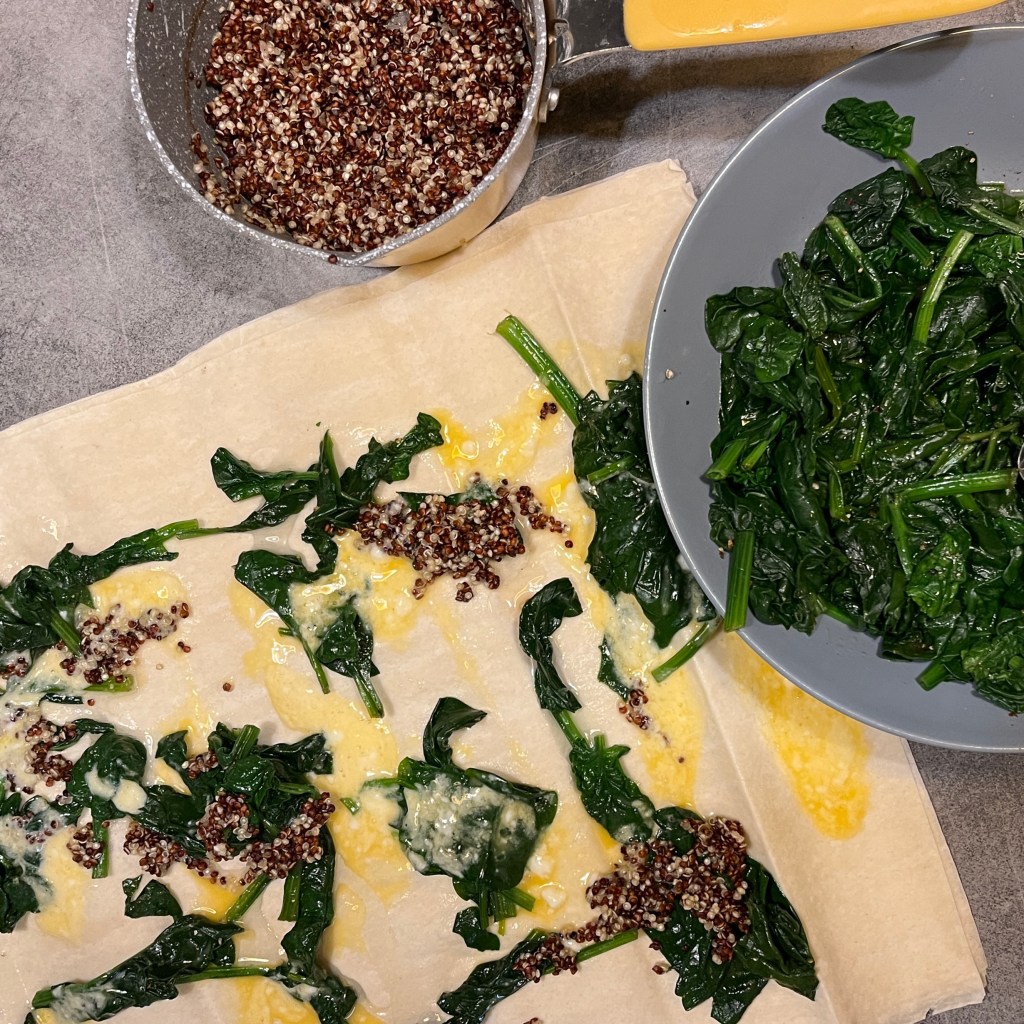 Върху всеки лист от корите за баница нанасяйте по няколко лъжички от яйчената смес, киноа, сирене, спанак и супена лъжица олио. Завийте листата на руло и поставете в тава. Накрая залейте баницата с разтопено масло и ако ви е останала от яйчената смес.