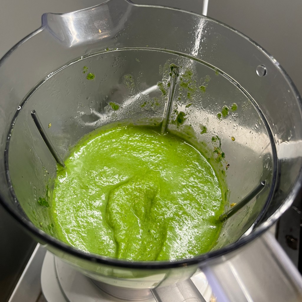 В друга тенджера в подсолена вряща вода сложете всички продукти без маслото да се запарят за 6 мин. Отцедете водата, като я запазите, това е чудесен зеленчуков бульон, който може да използвате за супа или ризото. Пасирайте запарените зеленчуци като добавите малко от бульона до получаване на гъст сос. Добавете маслото.