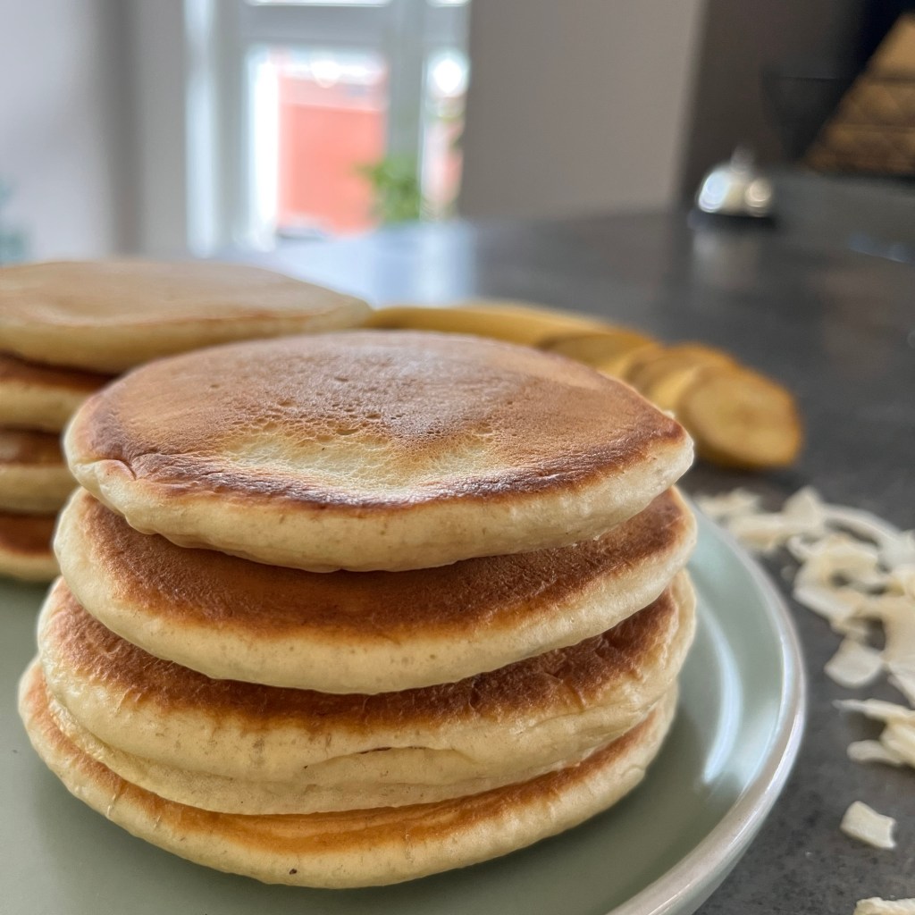 Разбърквате яйцето с кокосовото мляко и водата (или прясното мляко). Намачквате банана и добавяте към сместа заедно с брашното и бакпулвера. Разбърквате до хомогенна смес