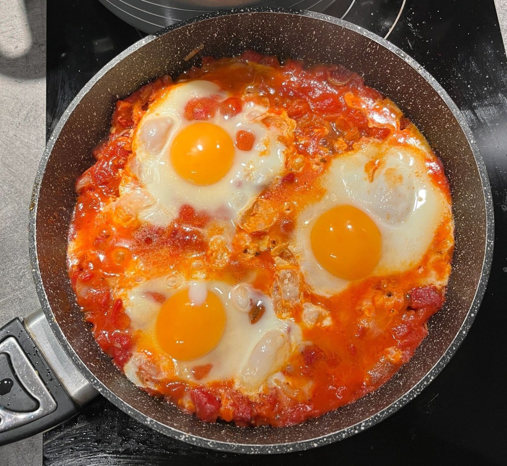 В тиган запържвате подправките с лук и чесън в зехтин. Добавете чушките, запържвате за 1 минута. Прибавяте доматения сол и по желание малко вода, ако сметнете че сместа е прекалено гъста като разбъркате добре. Чуквате яйцата по краищата на тигана и оставате да се сготвят, докато целият белтък побелее (около 5-6 мин) Много важно е да не бъркате, за да не получите миш маш. Затова е ключово сметта ви първоначално да не е гъста, защото част от водата на доматите ще се изпари и може да загори докато яйцата ви се готвят.