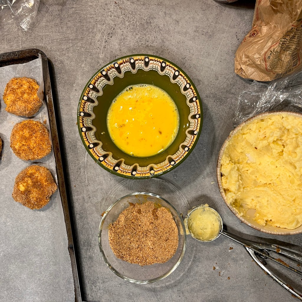 Обелете картофите докато са топли и намачкайте. Добавете маслото и спанака. Разбъркайте и овкусете със сол и черен пипер. Оформете малки кюфтенца, потопете в разбитите яйца, оваляйте в смес от галета и царевично брашно.