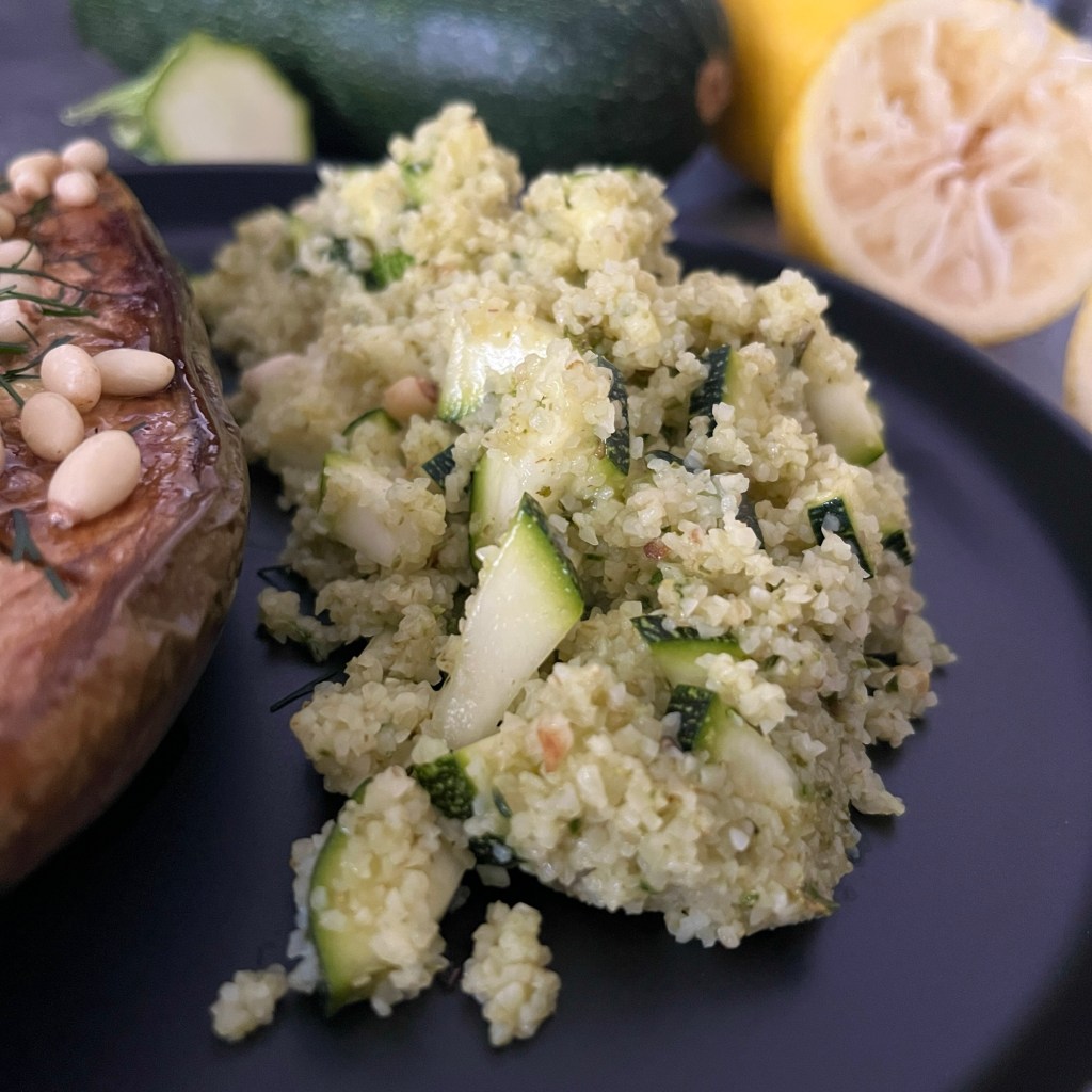 Когато булгура е готов добавяте тиквичките, разбърквате и сервирате