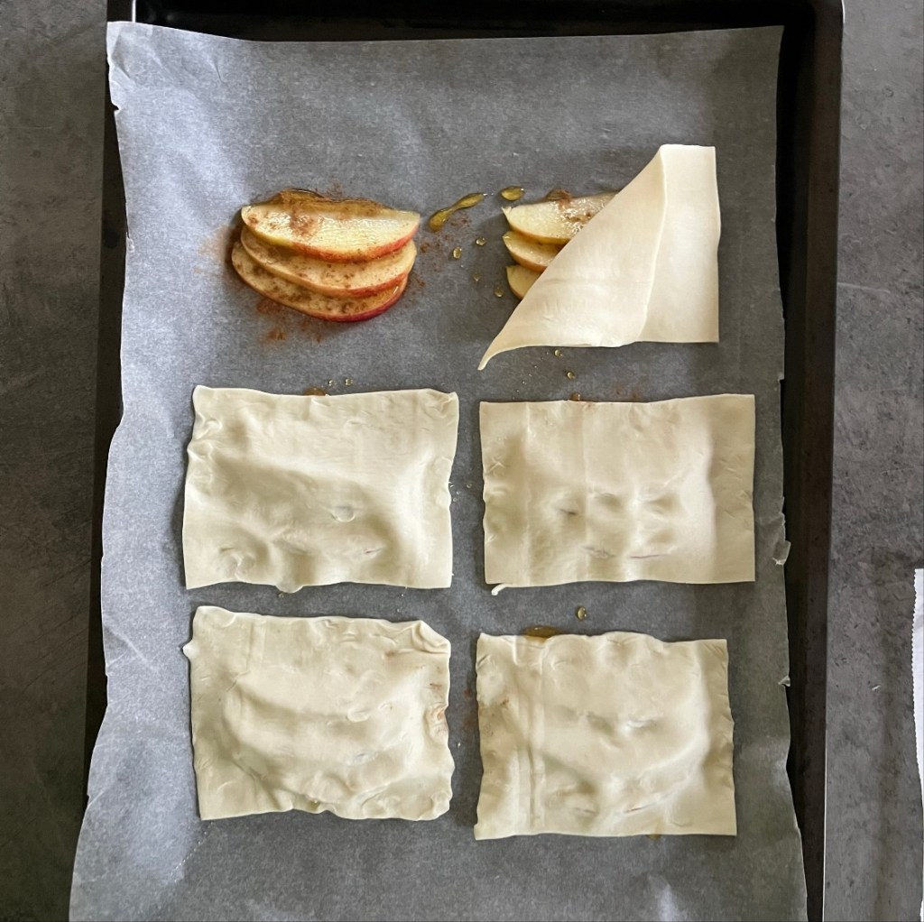 В тава с хартия за печене поставете по 3 резенчета ябълка като поръсите с канела и чаена лъжица мед. Покрийте с разрязаното тесто като леко притиснете около ябълките.